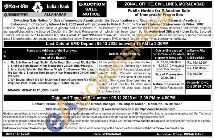 All that part and parcel of private Plot No. 14, Khasra No. 432, Shahpur Tigri, Thana Majhola, District & Pargana Moradabad-244001 Uttar Pradesh admeasuring 133.50 Sq mtr. In the name of Smt. Kanta W/o Sh. Shiv Kumar Singh bounded as under: - East: Plot No. 13, West: Arazi Ramesh, North: 18ft. wide Road, South: Arazi Amar Singh