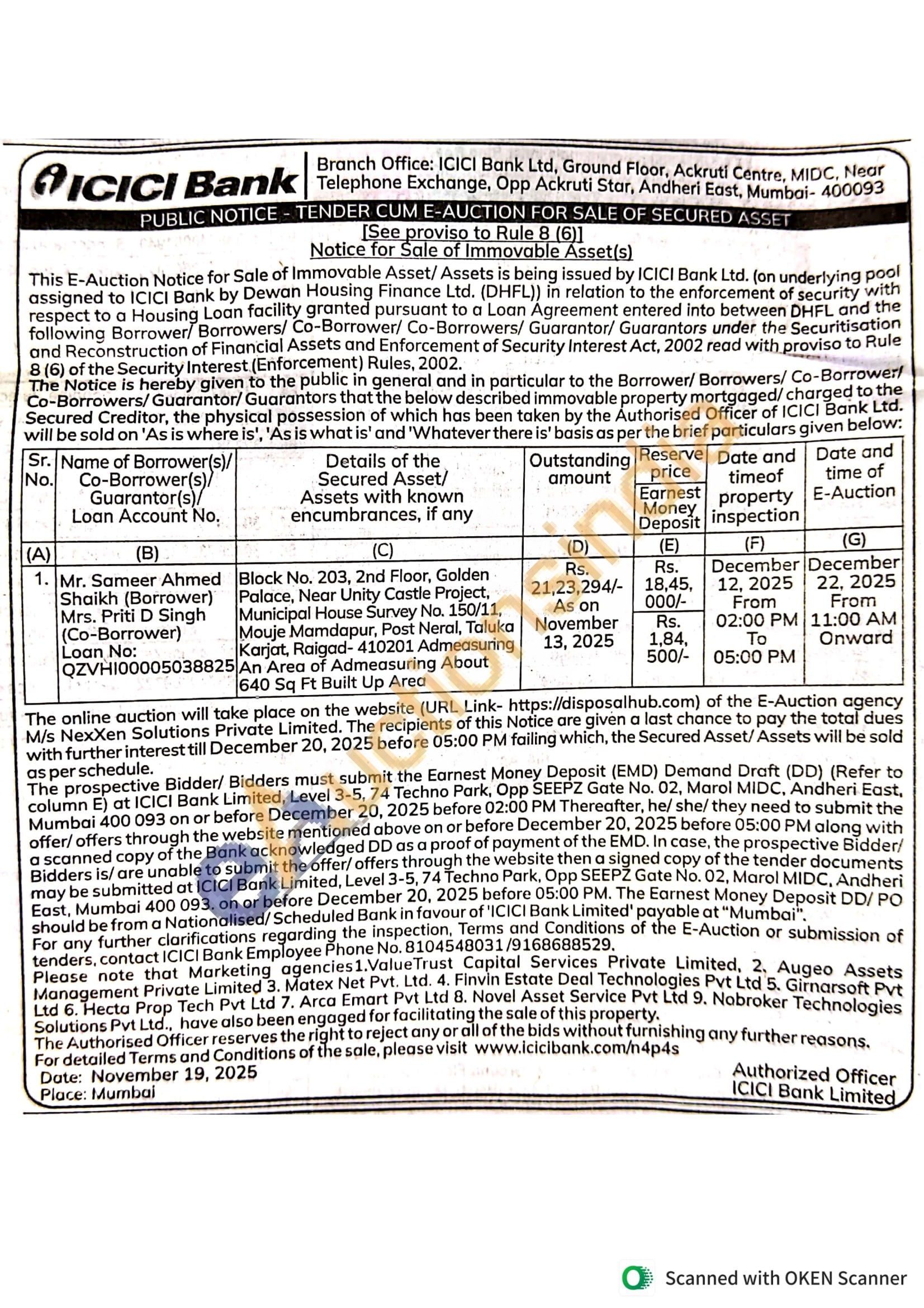Block No. 203, 2nd Floor, Golden Palace, Near Unity Castle Project, Municipal House Survey No. 150/11, Mouje Mamdapur, Post Neral, Taluka Karjat, Raigad-410201 Admeasuring An Area of Admeasuring About 640 Sq Ft Built Up Area