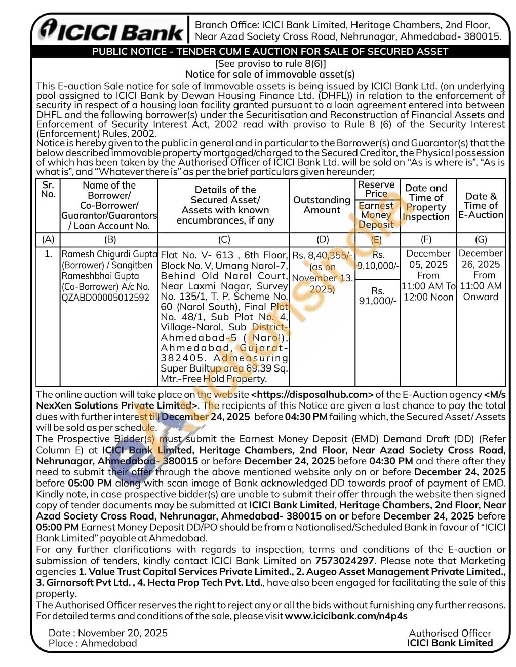 Flat No. V-613, 6th Floor, Block No. V. Umang Narol-7, Behind Old Narol Court. Near Laxmi Nagar, Survey No. 135/1, T. P. Scheme No. 60 (Narol South), Final Plot No. 48/1, Sub Plot No. 4. Village-Narol, Sub District-Ahmedabad-5 (Narol), Ahmedabad, Gujarat-382405. Admeasuring Super Builtup area 69.39 Sq. Mtr.-Free Hold Property