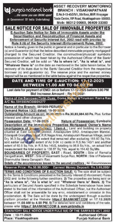 1.Item-A: Land and building on property situated at East Godavari District, Amalapuram SRO, Amalapuram Mandal, Edarapalli Gram Panchayat, R.R. Nagar Area, Amalapuram Revenue Village, zeroit Dry 36.3 Sq yds, being the extent that remained after excluding 181.60 Sq. Yds sold earlier out of total extent of Ac 0-04 1/2 cents in R.S. No. 145/1 and another extent of 60.5 Sq. Yds. in R.S.No. 145/2, totalling to 96.8 Sq. Yds., on actual field measurement the total extent is 136.87 Sq. Yds. equal to 114.42 Sq.Mis BOUNDARIES OF PROPERTY: EAST Road, SOUTH Site of Remalla Gangadharam, WEST: Site of Vasamsetti Surya Rao, NORTH: Site of Padavala Shanmukha Veera Ganapathi Rao. Details of the encumbrances known to the secured creditors: