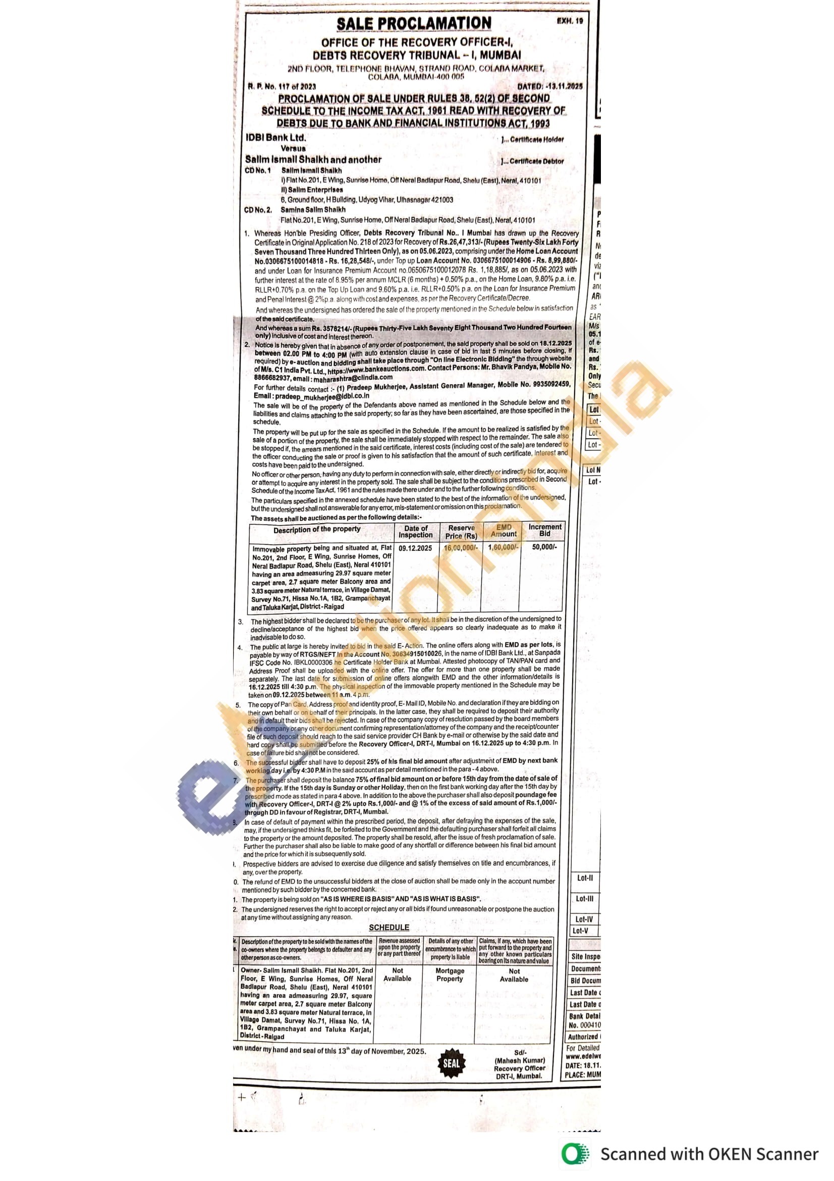Immovable property being and situated at, Flat No.201, 2nd Floor, E Wing, Sunrise Homes, Off Neral Badlapur Road, Shelu (East), Neral 410101 having an area admeasuring 29.97 square meter carpet area, 2.7 square meter Balcony area and 3.83 square meter Natural terrace, in Village Damat, Survey No.71, Hissa No.1A, 1B2, Grampanchayat and Taluka Karjat, District-Raigad