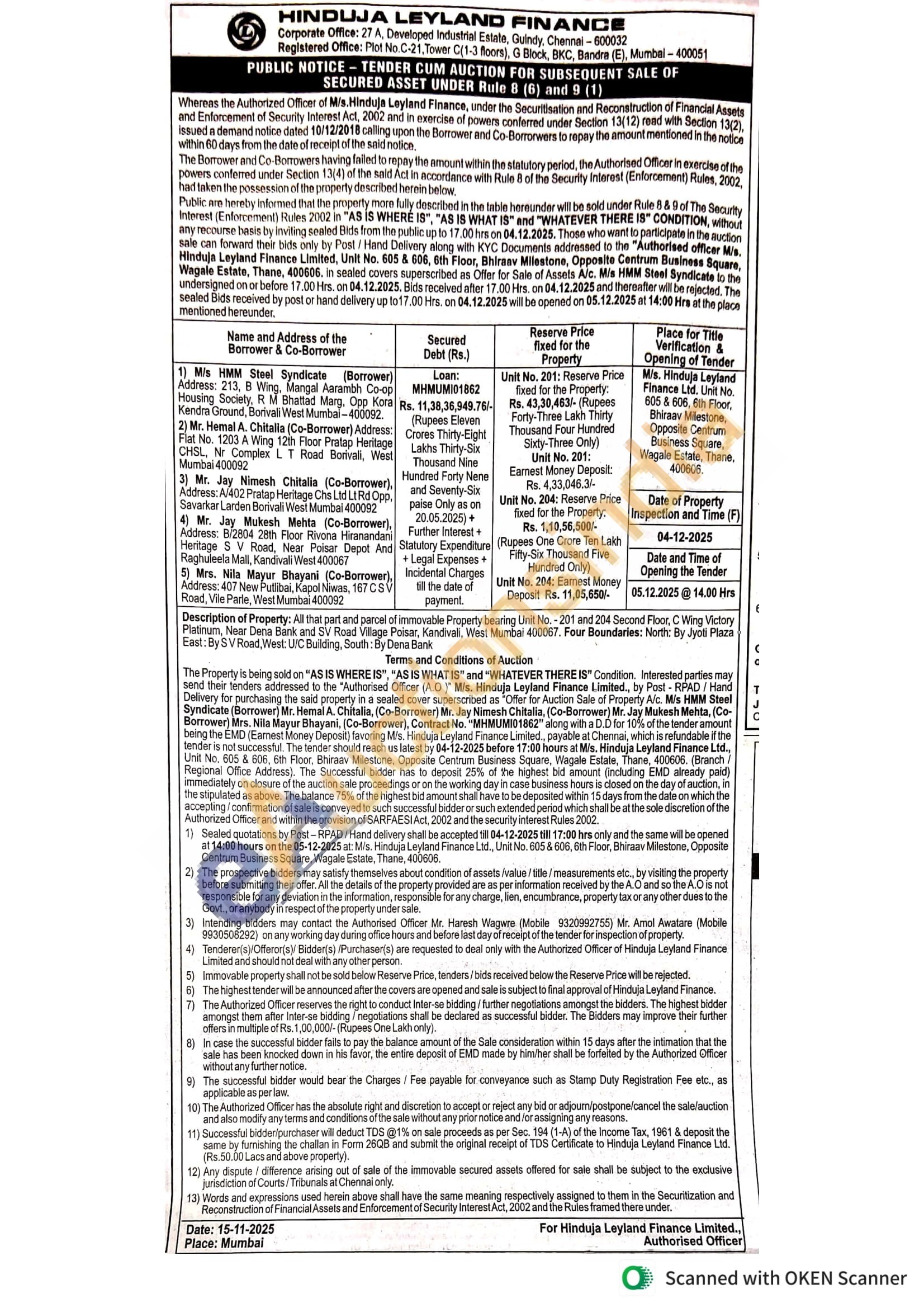 All that part and parcel of immovable Property bearing Unit No. -201 and Second Floor, C Wing Victory Platinum, Near Dena Bank and SV Road Village Poisar, Kandivali, West Mumbai 400067. Four Boundaries: North: By Jyoti Plaza East: By SV Road, West: U/C Building, South: By Dena Bank