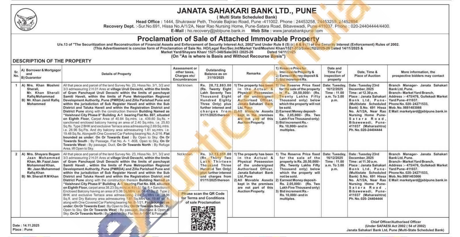 All that piece and parcel of the land Survey No. 23, Hissa No. 3/1, 3/2 and 3/3 admeasuring 2 H.01 Ares at village Uruli Devachi, within the limits of Gram Panchayat Uruli Devachi within the limits of panchayat Samiti Haveli, within the limits of Pune Metropolitan Regional Development Authority, Pune (PMRDA) and Zilla Parishad Pune and within the jurisdiction of Sub Register Haveli and within the Sub District and Taluka Haveli and within the Registration District and District Pune along with the construction thereon Building Named as "Vaishnavi City Phase II" Building A-1 bearing Flat No. 808, situated on Eighth Floor, carpet area 38.23 Sq.mtrs i.e. 411.51 Sq. ft. + Sanctioned Enclosed Balcony having an area of 5.06 Sq.Mtrs. i.e. 54.47 Sq. ft. Type 2 BHK and exclusive Terrace area admeasuring 2.69 Sq.Mtrs i.e. 28.96 Sq.ft. and Dry Balcony area admeasuring 1.81 Sq.Mtrs i.e. 19.48 sq. ft. along with One Covered Car Parking bearing No. B-1/21, Flat bounded as under: On Or Towards East: By Open to Sky, On Or Towards South: By Open to Sky. On Or Towards West: By passage, Staircase & Open to Sky. On Or Towards North: By Open to Sky, Flat No. A-1/807 & Passage