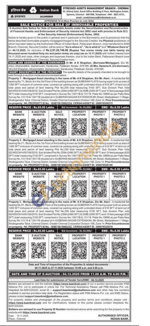 Property 1-Mortgaged Asset standing in the name of Mr. AK Shajahan, S/o Mr. Alavi: A residential flat bearing No.11, Block-A in the 3rd Floor of the building known as GUBERAN FLATS having super built up area of 1260 SFT inclusive of common area, covered car parking along with undivided share of 416 SFT of land out of total piece and parcel of land bearing Plot No.259 total measuring 5100 SFT. Sub Division Plan Vide SD/WDCN14/00108/2019, Sub Divided Plot No.259A (2480 SFT) & 259B (2000 SFT) and 10 feet passage (620 SFT) total measuring 5100 SFT, comprised in Survey No. 130/118 & 131/18, Patta No. 19898 as per Patta New Survey No. 131/18 & 130/11B situated at in GUBERAN NAGAR EXTENSION 8th Street, Madipakkam-1 Village. Sholinganallur Taluk, Chennai District, Greater Chennai Corporation Division-188, Zone 14. Prior Encumbrances