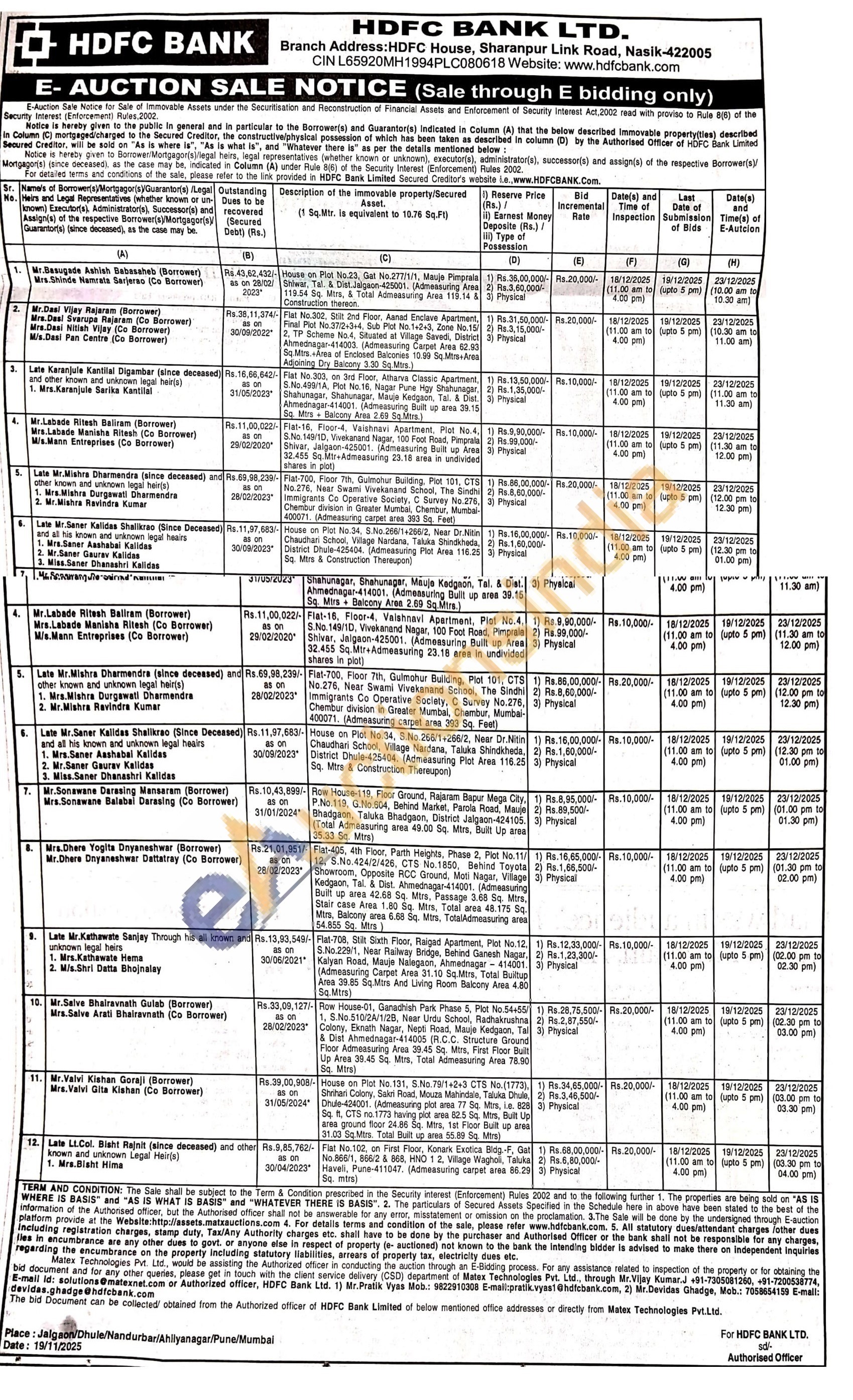 Flat-16, Floor-4, Vaishnavi Apartment, Plot No.4, S.No. 149/1D, Vivekanand Nagar, 100 Foot Road, Pimprala Shivar, Jalgaon-425001. (Admeasuring Built up Area 32.455 Sq.Mtr+Admeasuring 23.18 area in undivided shares in plot)