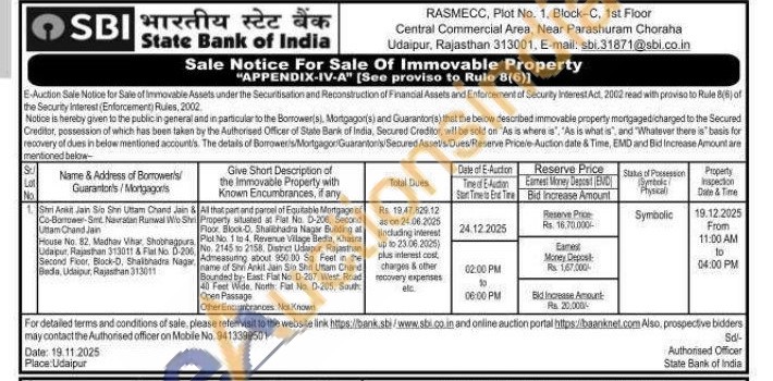 All that part and parcel of Equitable Mortgage of Property situated at Plat No. D-206, Second Floor Block C. Sihalibhadra Nagar Building af Plot No 1 to 4. Revenue Village Bedia, Khatra No. 2145 to 2158. District Udaipur Rajasthan Admeasuring about 850.00 Sq. Feet in the name of Shn Ankit Ankit Jain Sio Shi Uttam Chand Bounded by- East: Flat No. D-287, West Road 4 Feet Wide, forth Pat No. D-205, Sout Open Passage Other Encumbrances Not Known