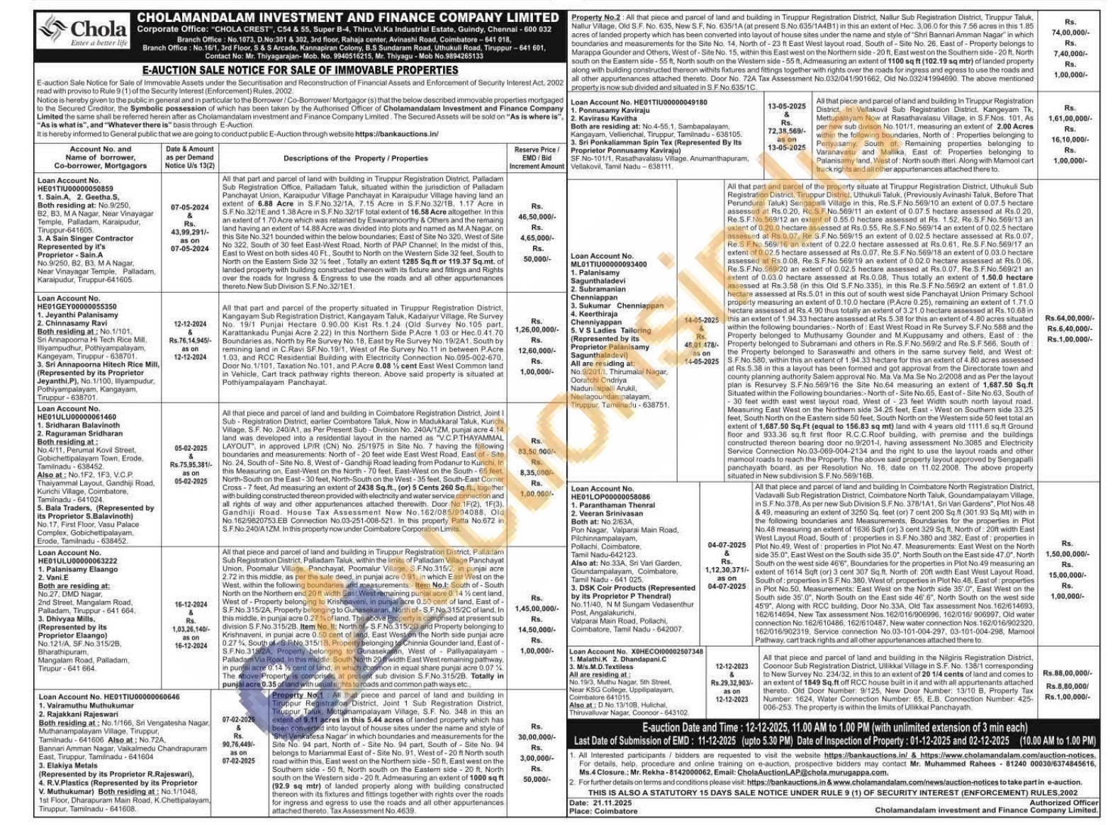 5) Property No.1: All that piece and parcel of land and building in Tiruppur Registration District, Joint 1 Sub Registration District, Tiruppur Taluk, Muthanampalayam Village, S.F. No. 348 in this an extent of 9.11 acres in this 5.44 acres of landed property which has been converted into layout of house sites under the name and style of Shri Venkatesa Nagar in which boundaries and measurements for the Site No. 94 part, North of Site No. 94 part, South of Site No. 94 belongs to Mariammal East of-Site No. 91, West of-20 ft North south road within this, East west on the Northern side-50 ft. East west on the Southern side 50 ft. North south on the Eastern side-20 ft. North south on the Western side-20 ft. Admeasuring an extent of 1000 sq ft (92.9 sq mtr) of landed property along with building constructed thereon with its fixtures and fittings together with rights over the roads for ingress and egress to use the roads and all other appurtenances attached thereto. Tax Assessment No.4639
