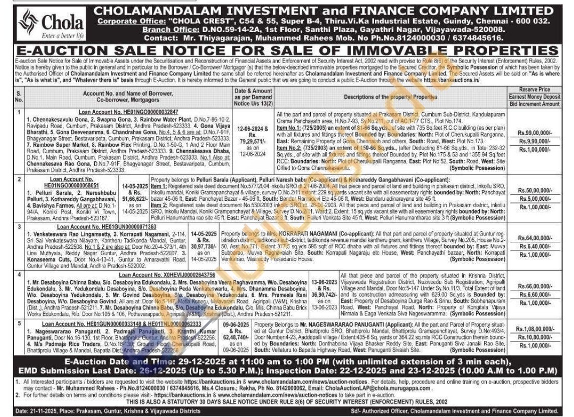 1)All the part and parcel of property situated at Prakasam District, Cumbum Sub-District, Kandulapuram Grama Panchayath area, H.No. 7-93, Sy No.211, out of AC.1-77 CTS., Plot No.174. Item No.1: (725/2005) an extent of 81-66 Sq.yds., of site with 735 Sq. feet R.C.C building (as per plan) with all fixtures and fittings thereof Bounded by: Boundaries: North: Plot of Cherukupalli Ranganna, East: Remaining Property of Gona Chennaiah and others, South: Road, West: Plot No.173. Item No.2: (735/2003) an extent of 150-66 Sq.yds., (after Deducting 81-66 Sq.yds., in Total 232-32 Sq.yds., of site with all fixtures and fittings thereof Bounded by, Plot No.175 & 53 and 1355.94 Sq feet RCC: Boundaries: North: Plot of Cherukupalli Ranganna, East: Plot No.52, South: Road, West: Site Gifted to Gona Chennakesavulu.
