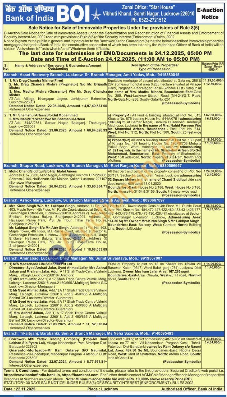 Contact Branch: Asset Recovery Branch, Lucknow, Sr. Branch Manager, Amit Yadav, Mob.: 9415389015