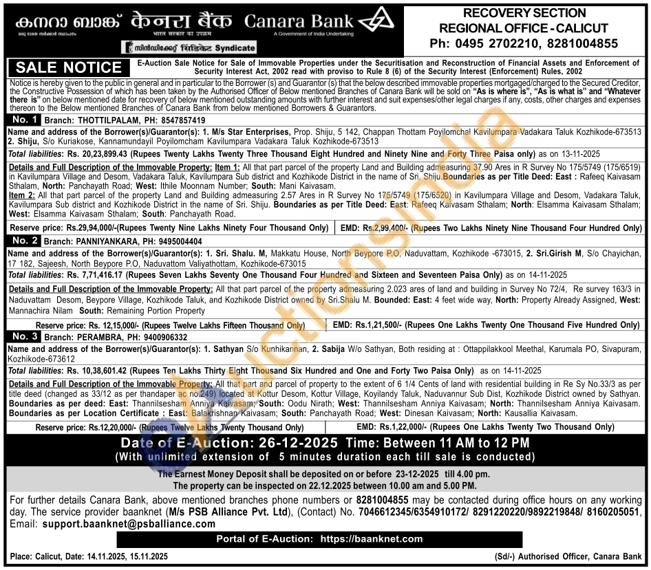 2) All that part parcel of the property admeasuring 2.023 ares of land and building in Survey No 72/4, Re survey 163/3 in Naduvattam Desom, Beypore Village, Kozhikode Taluk, and Kozhikode District owned by Sri.Shalu M. Bounded: East: 4 feet wide way, North: Property Already Assigned, West: Mannachira Nilam South: Remaining Portion Property
