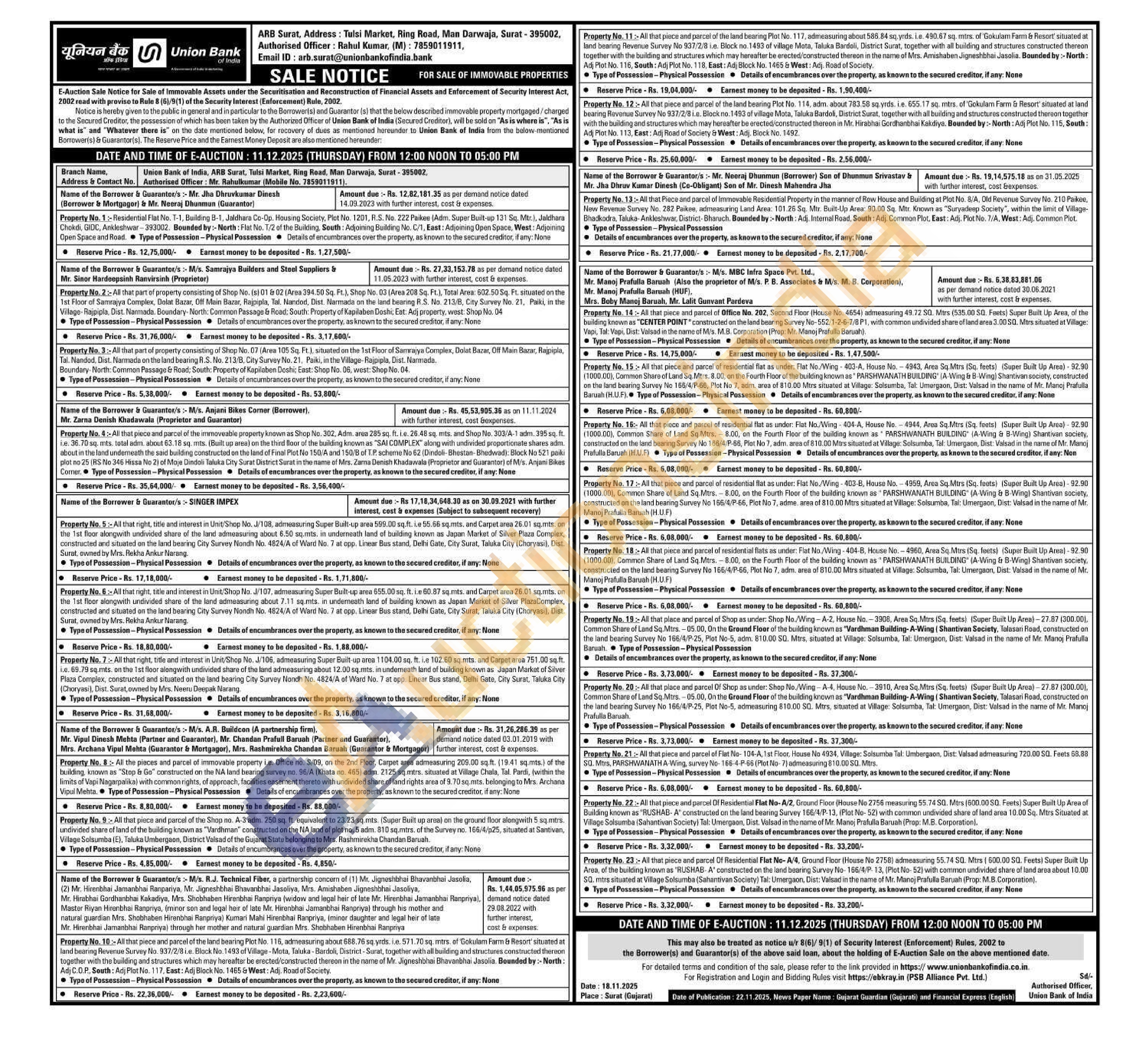 Property No. 1:- Residential Flat No. T-1, Building B-1, Jaldhara Co-Op. Housing Society, Plot No. 1201, R.S. No. 222 Paikee (Adm. Super Built-up 131 Sq. Mtr.), Jaldhara Chokdi, GIDC, Ankleshwar-393002. Bounded by:-North: Flat No. T/2 of the Building, South: Adjoining Building No. C/1, East: Adjoining Open Space, West: Adjoining Open Space and Road. Type of Possession-Physical Possession Details of encumbrances over the property, as known to the secured creditor, if any: None