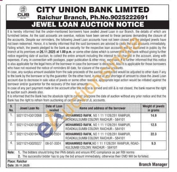 City Union Bank Gold Auctions Auction in Raichur