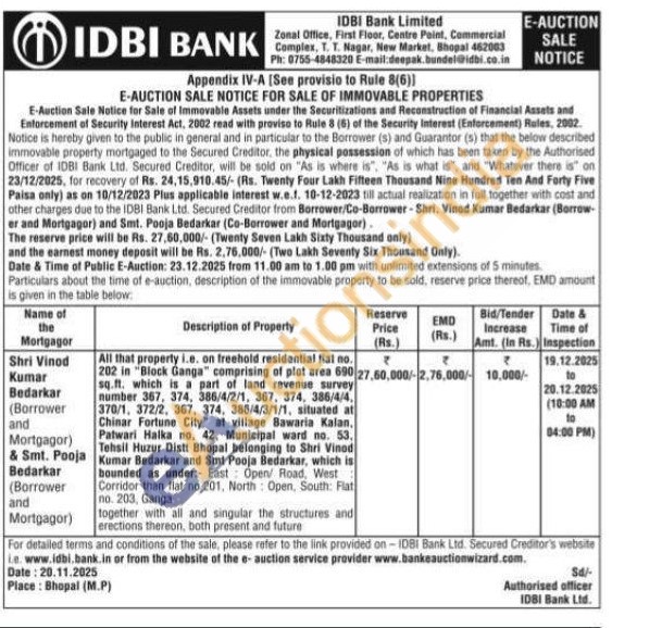 All that property i.e. on freehold residential flat no. 202 in "Block Ganga" comprising of plot area 690 sq.ft. which is a part of land revenue survey number 367, 374, 386/4/2/1, 367, 374, 386/4/4, 370/1, 372/2, 367, 374, 386/4/3/1/1, situated at Chinar Fortune City" at village Bawaria Kalan. Patwari Halka no, 42, Municipal ward no. 53, Tehsil Huzur Distt Bhopal belonging to Shri Vinod Kumar Bedarkar and Smt Pooja Bedarkar, which is bounded as under: East Open/ Road, West Corridor than flat no.201. North: Open, South: Flat no. 203, Ganga