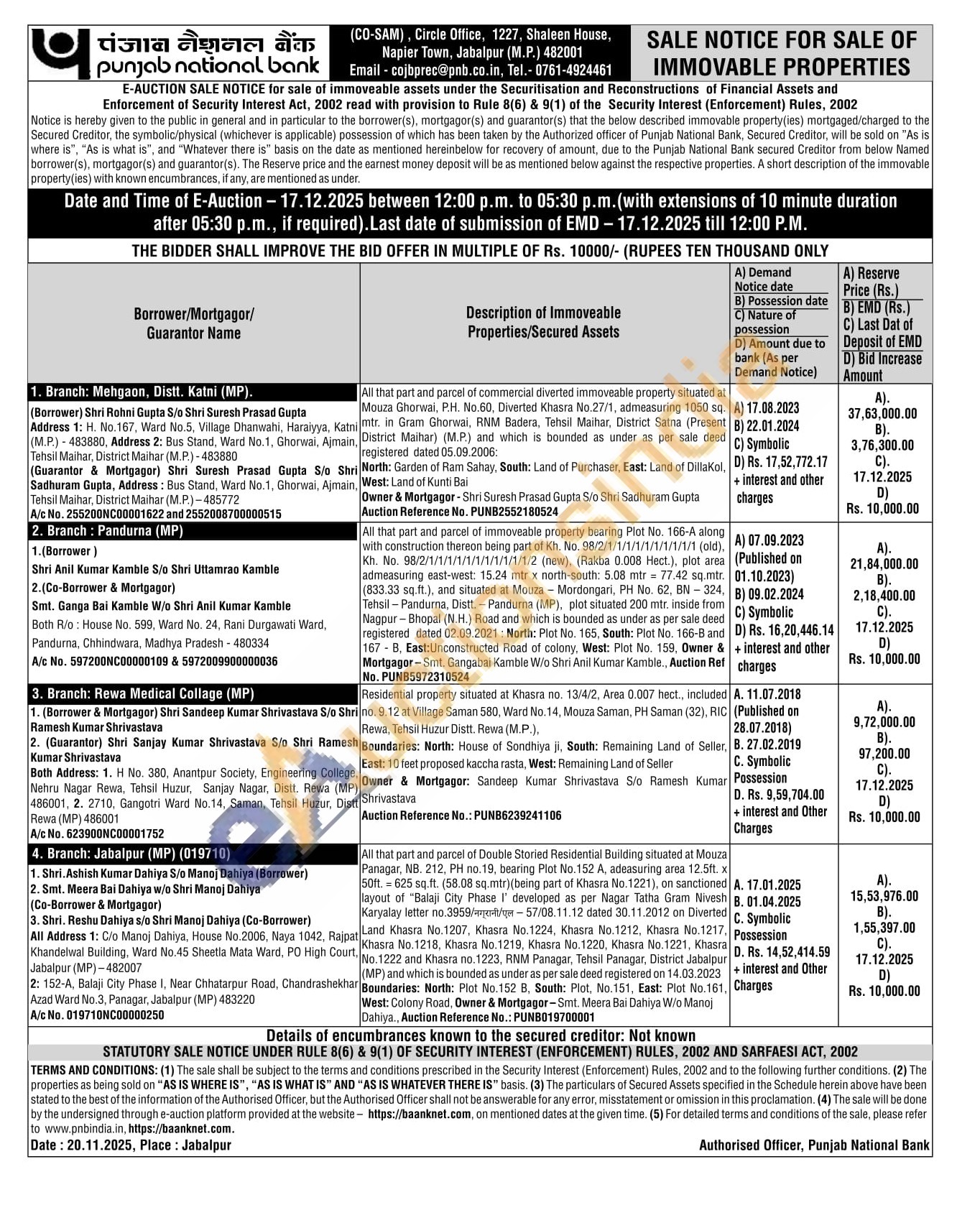 1) All that part and parcel of commercial diverted immoveable property situated at Mouza Ghorwai, P.H. No.60, Diverted Khasra No.27/1, admeasuring 1050 sq. mtr. in Gram Ghorwai, RNM Badera, Tehsil Maihar, District Satna (Present District Maihar) (M.P.) and which is bounded as under as per sale deed registered dated 05.09.2006: North: Garden of Ram Sahay, South: Land of Purchaser, East: Land of DillaKol. West: Land of Kunti Bai Owner & Mortgagor-Shri Suresh Prasad Gupta S/o Shri Sadhuram Gupta Auction Reference No. PUNB2552180524