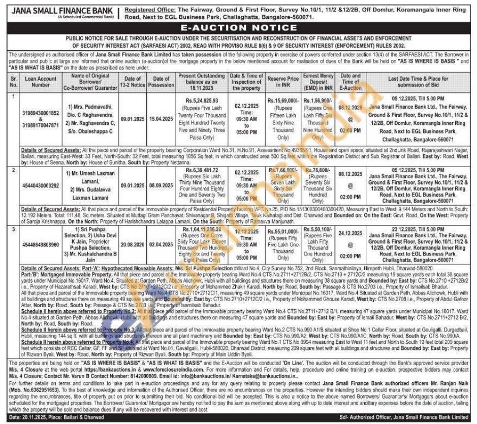 Details of Secured Assets: Part-'A': Hypothecated Moveable Assets: Mis. Sri Pushpa Selection #Ward No.4, City Survey No. 752, 2nd Block, Sanmathinilaya, Hirepeth Hubli, Dharwad-580020. Part-'B'. Mortgaged Immovable Property: All that piece and parcel of the Immovable property bearing Ward No.4 CTS No.2711+27128/2, CTS No 2710 27120/2 measuring 19 square yards each total 38 square yards under Municipal No. 16017, Ward No.4, Situated at Garden Peth, Abbas Alichowk, Hubli with all buildings and structures there on measuring 38 square yards and Bounded by: East by: CTS No.2710+27128/2 ie, Property of Hazarathsab Karadi, West by: CTS No.2710 +27120/2 ie, Property of Mohammed Zhakir Karadi, North by: Road, South by: Passage & CTS No.2703 ie, Property of Ismailsab Bhadur. All that piece and parcel of the Immovable property bearing Ward No.4 CTS No. 2710+27120/1, measuring 49 square yards under Municipal No. 16017, Ward No.4 Situated at Garden Peth, Abbas Alichowk, Hubli with all buildings and structures there on measuring 49 square yards and Bounded by: East by: CTS No.2710-2712C/2le, Property of Mohammed Ghouse Karadi, West by: CTS No.2708 Le., Property of Abdul Gafoor Attar, North by: Road, South by: Passage & CTS No.2703 ie., Property of Isamisab Bahadur. Schedule II herein above referred to Property No.2: All that piece and parcel of the Immovable property bearing Ward No.4 CTS No.2711+2712 B/1, measuring 47 square yards under Municipal No. 16017, Ward No.4 situated at Garden Peth, Abbas Alichowk, Hubli with all buildings and structures there on measuring 47 square yards and Bounded by: East by: Property of Ismail Bahadur, West by: CTS No.2711+2712 8/2, North by: Road, South by: Road. Schedule Il herein above referred to Property No.3: All that piece and parcel of the Immovable property bearing Ward No.2 CTS No.990 A1/B situated at Shop No. 1 Cellar Floor, situated at Gouligalli, Durgadbail, Hubli, measuring 144 sq.ft. with all buildings and structures thereon and all plant machinery and Bounded by: East by: CTS No. 990/A2, West by: CTS No.990/A1C, North by: Road, South by: CTS No.990/A Schedule Il herein above referred to Property No.4: All that piece and parcel of the Immovable property bearing Ward No.1 CTS No.3994 measuring East to West 11 feet and North to South 19 feet total 209 square feet which consists of RCC Cellar, GF, FF and SF situated at Ward No.01, Gavaligalli, Hubli-580020, Dharwad District, measuring 209 square feet with all buildings and structures and Bounded by: East by: Property of Rizwan Byali West by: Road, North by: Property of Rizwan Byali, South by: Property of Main Uddin Byali.