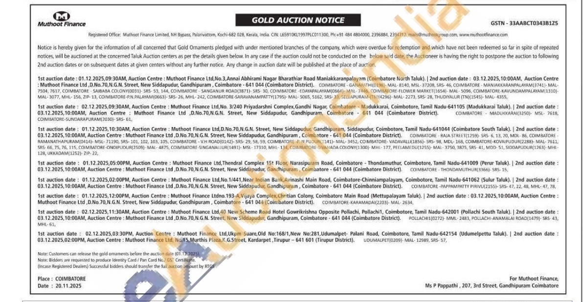 Muthoot Finance Ltd Gold Auctions Auction in Coimbatore