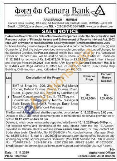 EMT of Shop No. 206. 2nd floor, Raj Mandir Corner, Behind Dumas Resort, Dumas Road, Surat, Gujarat 392 002 owned by Lalchand M 1 Tawari. Carpet area is 213 sq.ft. (19.78sq.m). Boundaries of the property: North-Passage & Stair, South-Entrance & Passage, East-Shop No. 207, West-Entrance & Passage