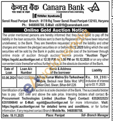 Canara Bank Gold Auctions Auction in Panipat