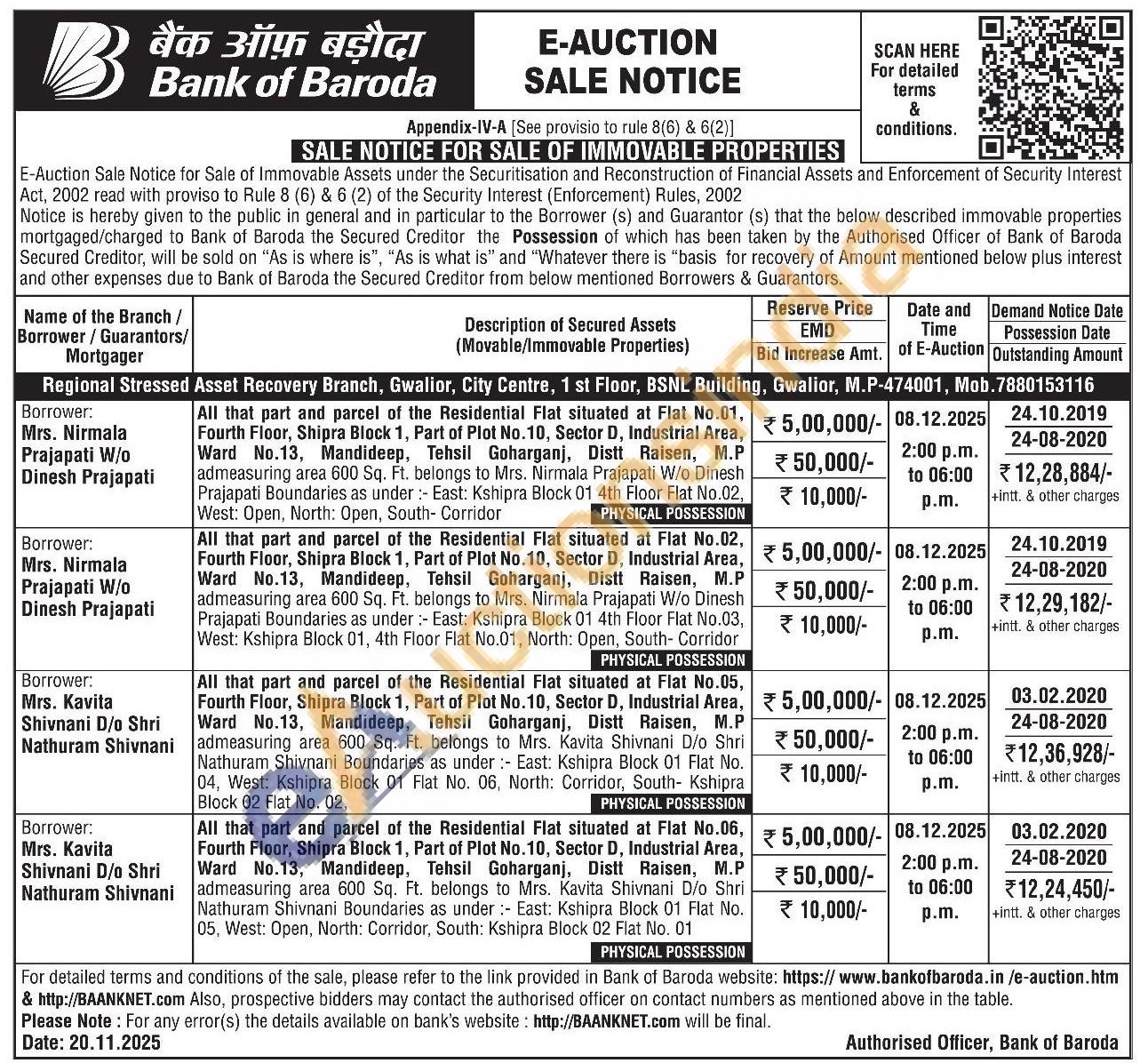 All that part and parcel of the Residential Flat situated at Flat No.01, Fourth Floor, Shipra Block 1, Part of Plot No.10, Sector D, Industrial Area, Ward No.13, Mandideep, Tehsil Goharganj, Distt Raisen, M.P admeasuring area 600 Sq. Ft. belongs to Mrs. Nirmala Prajapati W/o Dinesh Prajapati Boundaries as under :- East: Kshipra Block 01 4th Floor Flat No.02, West: Open, North: Open, South- Corridor