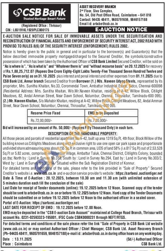 Schedule-A: Vacant house site bearing Old Door No. 12, New Door No.8, Thanigachalam Street, Perambur, Chennai-600 011, comprised in T.S.No. 149 as per Patta T.S.No. 149/2, Block No.30 of Sembium Village, Measuring: East to West on the Northern side: 61 Feet, Southern side: 63 feet and North to South on the Eastern side: 45 feet, Western side: 45 Feet, in all measuring an extent of 2745 Sq.Ft. Schedule B: All that 1492 Sq.Ft. or 138.62 Sq.Mt. of Undivided share of land in the Schedule-A mentioned property along with a Duplex Flat No.A & A-I in the Ground Floor and First Floor together with proportionate common area covered car parking marked as 3 and 4 in the building named as "Vaiduriyam". Bounded on the: North by: Property in T.S.No. 125, South by 6 ft wide common Passage, East by: Thanigachalam Street, West by: Property in T.S.No.149/3
