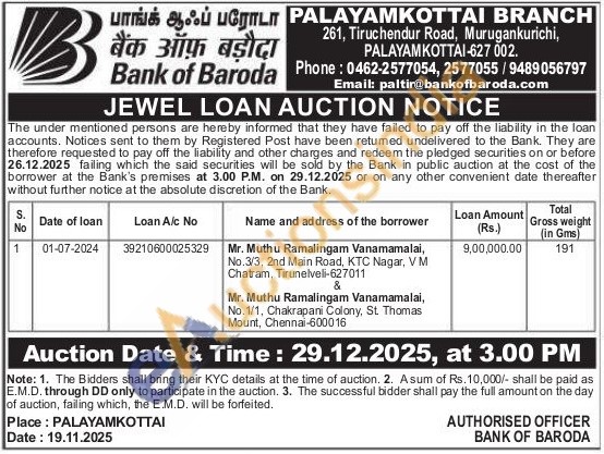 Bank of Baroda Gold Auctions Auction in Tirunelveli