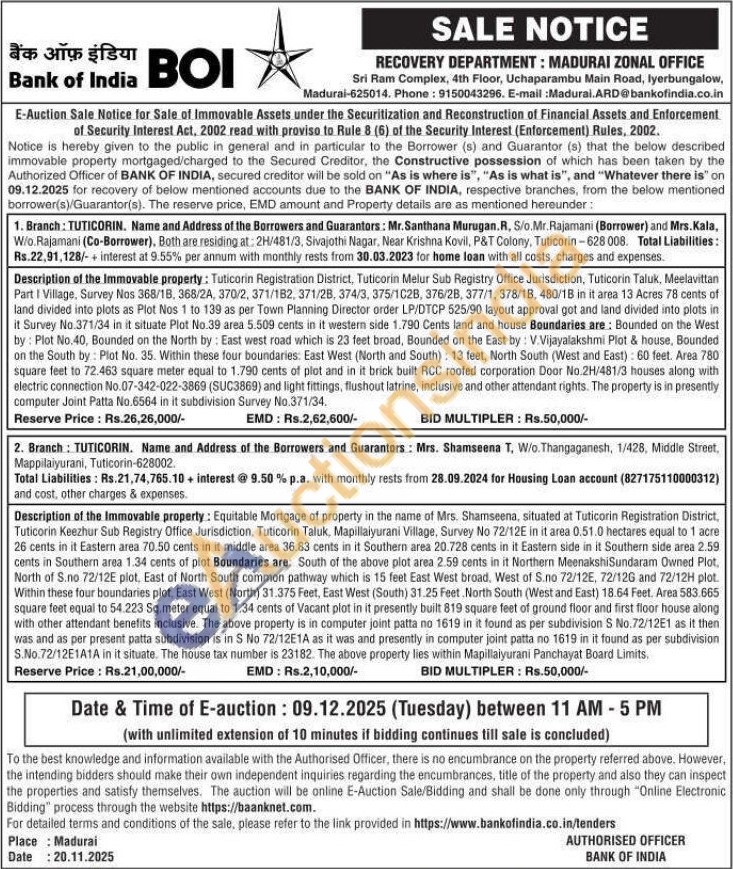 Description of the Immovable property: Tuticorin Registration District, Tuticorin Melur Sub Registry Office Jurisdiction, Tuticorin Taluk, Meelavittan Part I Village, Survey Nos 368/18, 368/24, 370/2, 371/182, 371/28, 374/3, 375/1028, 376/28, 377/1, 378/1B, 480/18 in it area 13 Acres 78 cents of land divided into plots as Plot Nos 1 to 139 as per Town Planning Director order LP/DTCP 525/90 layout approval got and land divided into plots in it Survey No.371/34 in it situate Plot No.39 area 5.509 cents in it western side 1.790 Cents land and house Boundaries are: Bounded on the West by: Plot No.40, Bounded on the North by: East west road which is 23 feet broad, Bounded on the East by: V.Vijayalakshmi Plot & house, Bounded on the South by: Plot No. 35. Within these four boundaries: East West (North and South): 13 feet, North South (West and East): 60 feet. Area 780 square feet to 72.463 square meter equal to 1.790 cents of plot and in it brick built RCC roofed corporation Door No.2H/481/3 houses along with electric connection No.07-342-022-3869 (SUC3869) and light fittings, flushout latrine, inclusive and other attendant rights. The property is in presently computer Joint Patta No.6564 in it subdivision Survey No.371/34