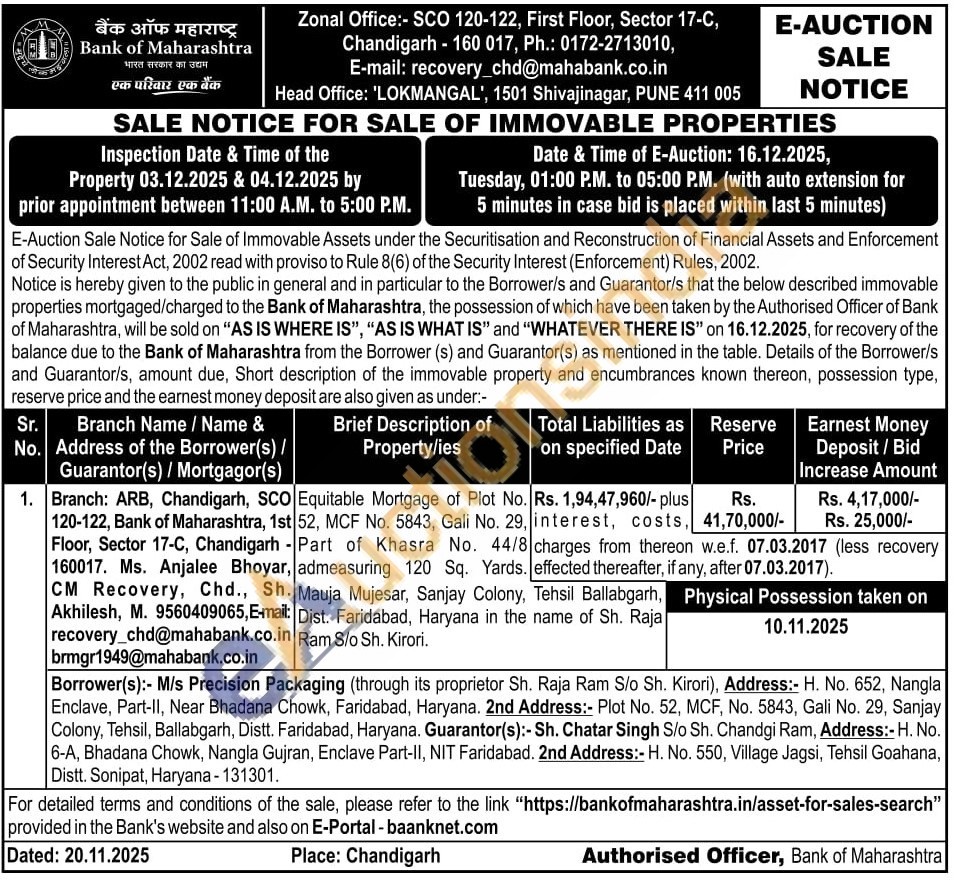 Equitable Mortgage of Plot No. 52, MCF No. 5843, Gali No. 29 Part of Khasra No. 44/8 admeasuring 120 Sq. Yards Mauja Mujesar, Sanjay Colony, Tehsil Ballabgarh, : Dist. Faridabad, Haryana in the name of Sh. Raja Ram S/o Sh. Kirori