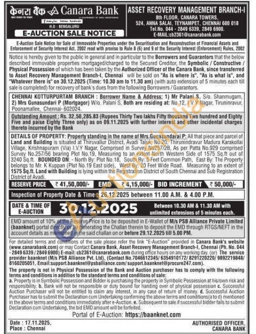 All that piece and parcel of Land and Building is situated at Thiruvallur District, Avadi Taluk, No. 20, Thirunindravur Madura Karakollai Village, Krishnapuram (Via) I.VY Nagar, Comprised in Survey No257/28, As per Patta No.929 comprised Survey No.257/56 bearing Plot No.19. Measuring to an extent North Western Side of 1575 Sq.ft out of 3240 Sq.ft. BOUNDED ON: North By: Plot No. 18, South By: 5 Feet Common Path, East By: The Property belongs to Mr. K. Kuppan (Plot No. 19 East side), West By: 20 Feet Wide Road. Measuring to an extent of 1575 Sq.ft. Land with Building is lying within the Registration District of South Chennai and Sub Registration
