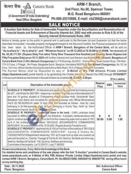 SCHEDULE 'C' PROPERTY: Apartment No.B-105 on First floor of the building of "SKYGOLD JEEVANKEERTHI COMMANDERS AEROVIEW", having E khatha No. 150300201901021350apartment measuring 1051 sq.ft super built up area one covered car park and bounded on: East By: Passage & Flat No.8-104, West by: Set Back and drive way. North by: Set Back & Flat No B-106 South by: Set Back and drive way. Coordinates of the property: Lat 13.230131, Long 77.692952