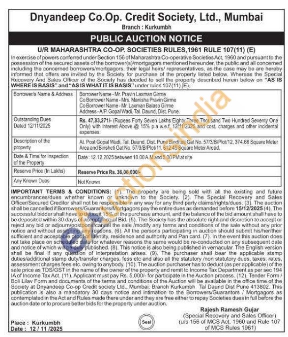 At. Post Gopal Wadi, Tal. Daund, Dist. Pune Bindheti Gat No. 57/3/B/Plot/12, 374.68 Square Meter Area and Binsheti Gat No. 57/3/B/Plot/11, 612.49 Square Meter Aread