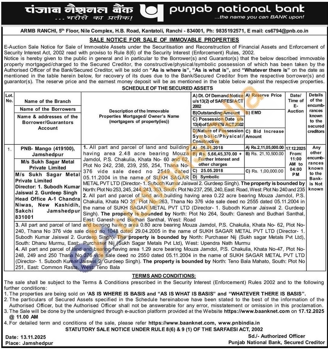 1. All part and parcel of land and building having area 2.48 acre bearing Mouza Jamdol, P.S. Chakulia, Khata No- 60 and 62, Plot No 242, 238, 239, 255, 254, Thana No-376 vide sale deed no 2549 dated 05.11.2004 in the name of SUKH SAGAR METAL PVT LTD (Director- 1. Subodh Kumar Jaiswal 2. Gurdeep Singh). The property is bounded by North: Plot No 253, 245, 244, 243, 353, South: Plot No 237, 256, 240, East: Road, West: Plot No 240 and 235 known 2. All part and parcel of land and building having area 0.22 acre bearing Mouza Jamdol, P.S. Chakulia, Khata NO 31, Plot No- 263, Thana No 376 vide sale deed no 2555 dated 05.11.2004 in the name of SUKH SAGAR METAL PVT LTD (Director- 1. Subodh Kumar Jaiswal 2. Gurdeep Singh). The property is bounded by North: Plot No 264, South: Ganesh and Budhari Santhal, East: Ganesh and Budhari Santhal, West: Road . All part and parcel of land and bearing having area 0.80 acre bearing Mouza Jamdol, P.S. Chakulia, Khata No- 62, Plot No-240, Thana No 376 vide sale deed no 1048 dated 29.04.2005 in the name of SUKH SAGAR METAL PVT LTD (Director- 1. Subodh Kumar Jaiswal 2. Gurdeep Singh). The property is bounded by North: Purchaser Nij (Sukh sagar Metals Pvt Ltd), South: Dhanu Murmu, East: Purchaser Nij (Sukh Sagar Metals Pvt Ltd), West: Upendra Nath Murmu 4. All part and parcel of land and bearing having area 1.29 acre bearing Mouza Jamdol, P.S. Chakulia, Khata No-47, Plot No-248, 249 and 250 Thana No 376 vide sale deed no 2550 dated 05.11.2004 in the name of SUKH SAGAR METAL PVT LTD (Director- 1. Subodh Kumar Jaiswal 2. Gurdeep Singh). The property is bounded by North: Teno Bala Mahato, South: Plot No 251, East: Common Rasta, West: Teno Bala