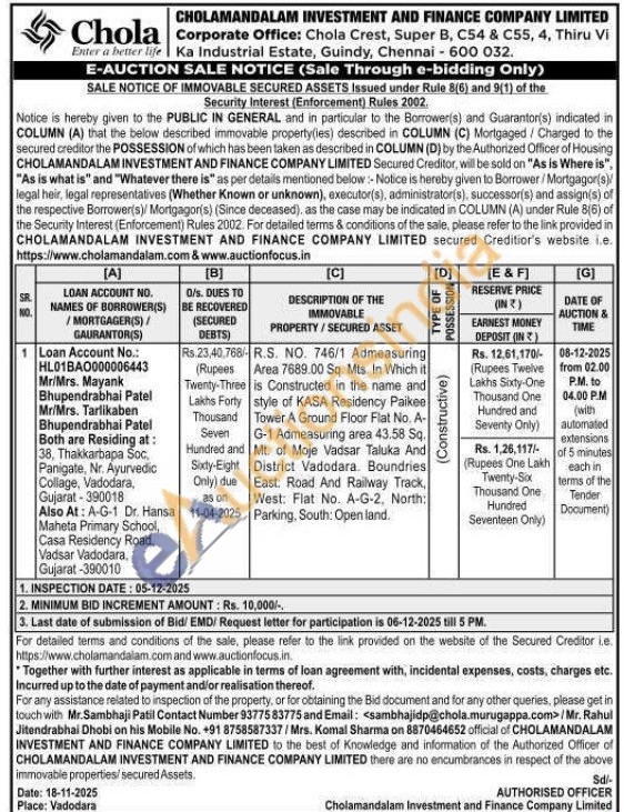 R.S. NO. 746/1 Admeasuring Area 7689.00 Sq. Mts. In Which it is Constructed in the name and style of KASA Residency Paikee Tower A Ground Floor Flat No. A-G-1 Admeasuring area 43.58 Sq. Mt. of Moje Vadsar Taluka And District Vadodara. Boundries East: Road And Railway Track, West: Flat No. A-G-2, North: Parking, South: Open land.