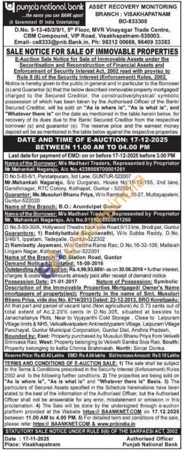(mortgagers of property(ies)); Property in the name of Smt. Musuluri Bhanu Priya, vide doc No. 6714/2013 Dated: 23-12-2013, SRO Koretipadu: All that part and parcel of vacant land (Non agriculture) Ac 0.73 cents out of total extent of Ac.2.20 1/2 cents in D.No.305, situated at besides to Janachaitanya Plots, Near to Vyjayanthi Cold Storage, Close to Lalpuram Village limits & NH5, Velivallivaripalem Ankireddypalem Village, Lalpuram Village Panchayat, Guntur Municipal Corporation, Guntur Dist, Andhra Pradesh, Bounded by: East: Property purchased by Musuluri Bhanu Priya from Velivelli Srinivasa Rao, West: Property belonging to Velivelli Samba Siva Rao, South: Property belonging to katta Chinna Brahmaiah, North: Sircar Donka