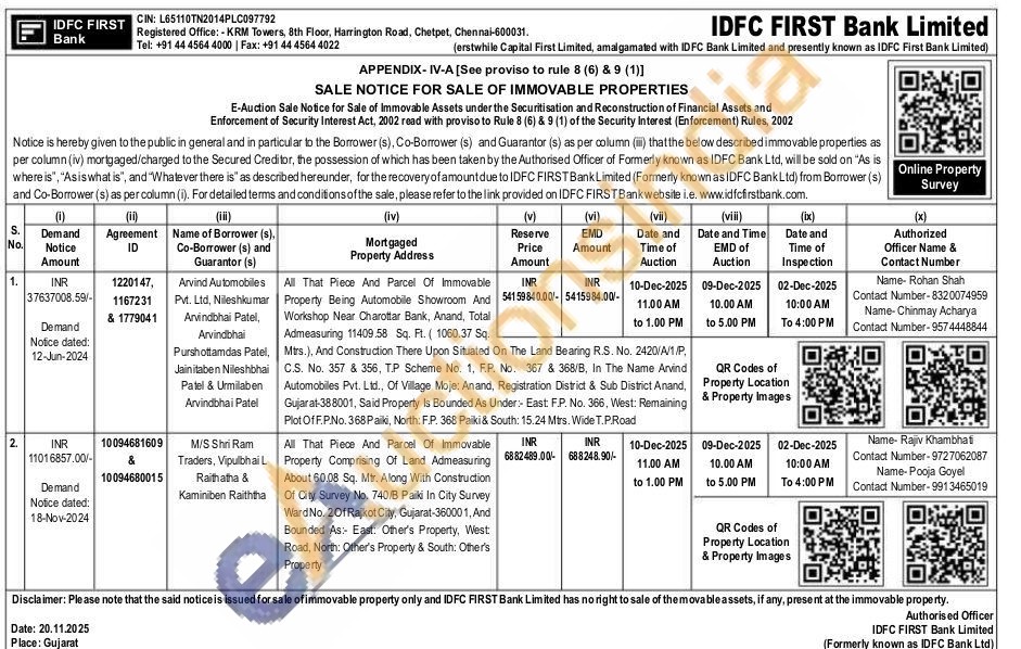 All That Piece And Parcel Of Immovable Property Being Automobile Showroom And Workshop Near Charottar Bank, Anand, Total Admeasuring 11409.58 Sq. Ft. (1060.37 Sq. Mtrs.), And Construction There Upon Situated On The Land Bearing R.S. No. 2420/A/1/P, C.S. No. 357 & 356, T.P Scheme No. 1, F.P. No. 367 & 368/B, In The Name Arvind Automobiles Pvt. Ltd., Of Village Moje: Anand, Registration District & Sub District Anand, Gujarat-388001, Said Property Is Bounded As Under:- East F.P. No. 366, West: Remaining Plot Of F.P.No. 368 Paiki, North: F.P. 368 Paiki & South: 15.24 Mtrs. Wide T.P.Road