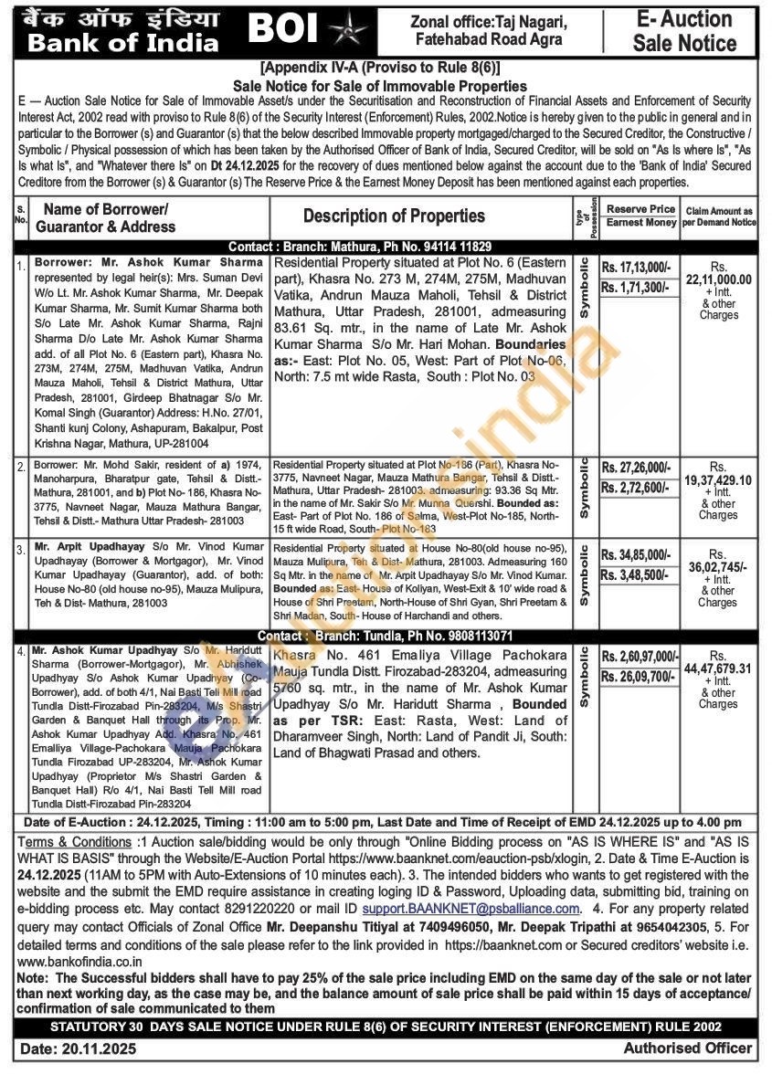 Khasra No. 461 Emaliya Village Pachokara Mauja Tundla Distt. Firozabad-283204, admeasuring Bounded 5760 sq. mtr., in the name of Mr. Ashok Kumar Upadhyay S/o Mr. Haridutt Sharma as per TSR: East: Rasta, West: Land of Dharamveer Singh, North: Land of Pandit Ji, South: Land of Bhagwati Prasad and others.