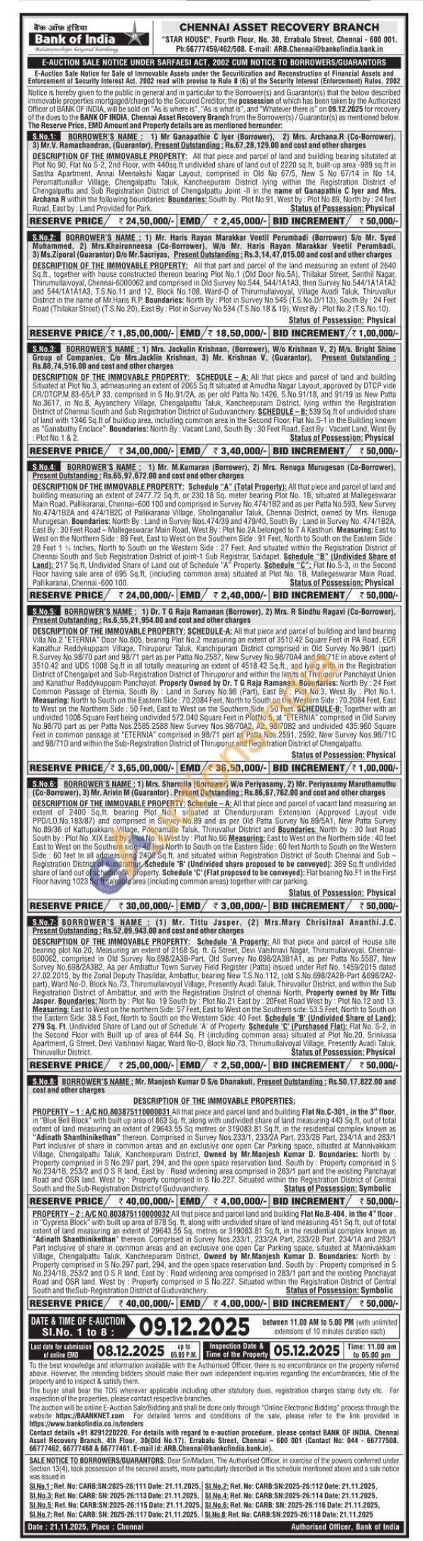 7) All that piece and parcel of House site bearing plot No.20, Measuring an extent of 2168 Sq. ft. G Street, Devi Vaishnavi Nagar, Thirumullaivoyal, Chennai-600062, comprised in Old Survey No.698/2A3B-Part, Old Survey No.698/2A3B1A1, as per Patta No.5587, New Survey No.698/2A3B2, Aa per Ambattur Town Survey Field Register (Patta) issued under Ref No. 1459/2015 dated 27.02.2015, by the Zonal Deputy Thasildar, Ambattur, bearing New T.S.No. 112, (old S.No.698/2A2B-Part &698/2A2-part), Ward No-D, Block No. 73, Thirumullaivoyal Village, Presently Avadi Taluk, Thiruvallur District, and within the Sub Registration District of Ambattur, and with the Registration District of chennai North, Property owned by Mr Tittu Jasper. Boundaries: North by: Plot No. 19 South by: Plot No.21 East by: 20Feet Road West by: Plot No. 12 and 13. Measuring: East to West on the northern Side: 57 Feet, East to West on the Southern side: 53.5 Feet, North to South on the Eastern Side: 38.5 Feet, North to South on the Western Side: 40 Feet. Schedule 'B' (Undivided Share of Land): 279 Sq. Ft. Undivided Share of Land out of Schedule 'A' of Property, Schedule 'C' (Purchased Flat): Flat No. S-2, in the Second Floor with Built up of area of 644 Sq. Ft (including common area) situated at Plot No.20, Srinivasa Apartment, G Street, Devi Vaishnavi Nagar, Ward No-D, Block No.73, Thirumullaivoyal Village, Presently Avadi Taluk, Thiruvallur District.