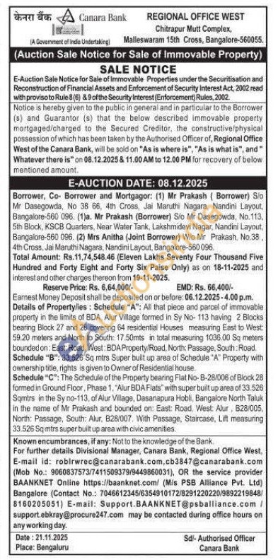 Schedule "A": All that piece and parcel of immovable property in the limits of BDA, Alur Village formed in Sy No- 113 having 2 Blocks bearing Block 27 and 28 covering 64 residential Houses measuring East to West: 59.20 meters and North to South: 17.50mts in total measuring 1036.00 Sq meters bounded on: East: Road, West: BDA Property Road, North: Passage, South: Road, Schedule "B": 33.526 Sq mirs Super built up area of Schedule "A" Property with ownership title, rights is given to Owner of Residential house. Schedule "C": The Schedule of the Property bearing Fiat No-B-28/006 of Block 28 formed in Ground Floor, Phase 1, "Alur BDA Flats" with super built up area of 33.526 Sqmtrs in the Sy no-113, of Alur Village, Dasanapura Hobli, Bangalore North Taluk in the name of Mr Prakash and bounded on: East: Road, West: Alur, B28/005, North: Passage, South: Alur, B28/007. With Passage, Staircase, Lift measuring 33.526 Sq mtrs super built up area with civic amenities