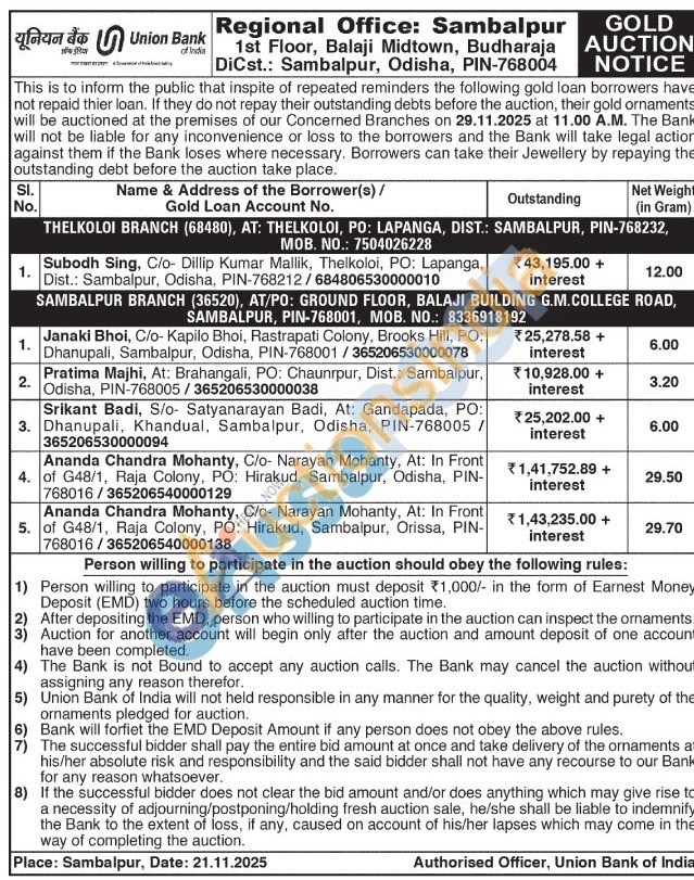 Union Bank of India Gold Auctions Auction in Sambalpur