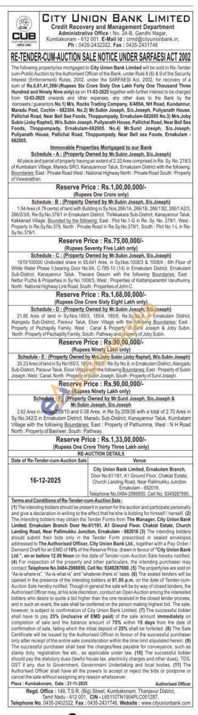 Contact Telephone No. 0484-2988850, Cell No. 9349287690.