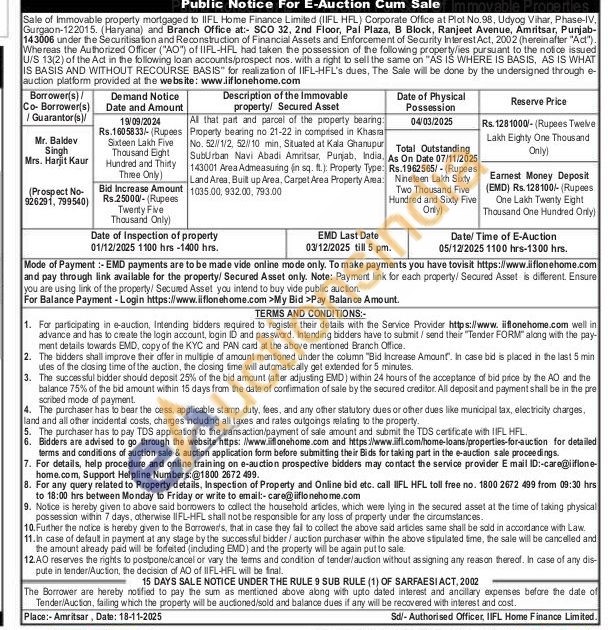 All that part and parcel of the property bearing: Property bearing no 21-22 in comprised in Khasra No. 52/1/2, 52//10 min, Situated at Kala Ghanupur Suburban Navi Abadi Amritsar, Punjab, India 143001 Area Admeasuring (in sq. ft.): Property Type Land Area, Built up Area. Carpet Area Property Arma 1035.00, 932.00, 793.00