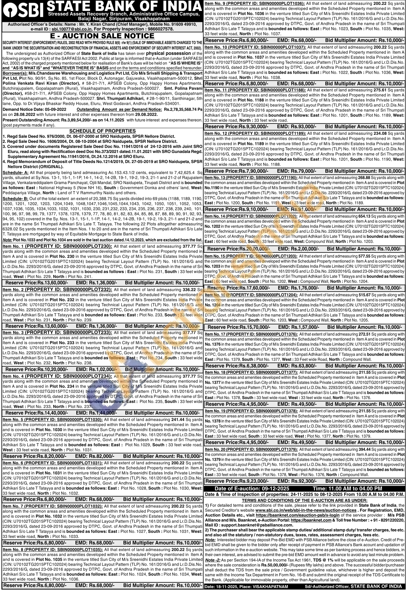 Contact Authorised Officer's Details: Name: Mr. Y. Kiran Chand (Chief Manager), Mobile No. 91609 49910, e-mail ID: sbi.10077@sbi.co.in, For Property Inspection: 9866027578