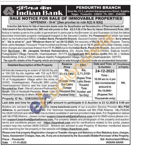 All that site measuring an extent of 120.00 Sq.yds or 100.335 Sq.mts together with 702 sq ft RCC slabbed Residential house covered by S.No. 108/10 of Pulagalipalem Village within the limits of GVMC, Visakhapatnam, Pendurthi SRO Limits, Visakhapatnam District and the total property Bounded by: East: Site of Lokanam Padmavathi, South: Site of Medisetti Pedatata, West: Site of Medisetti Kanakaraju & others, North: 30 feet Road.