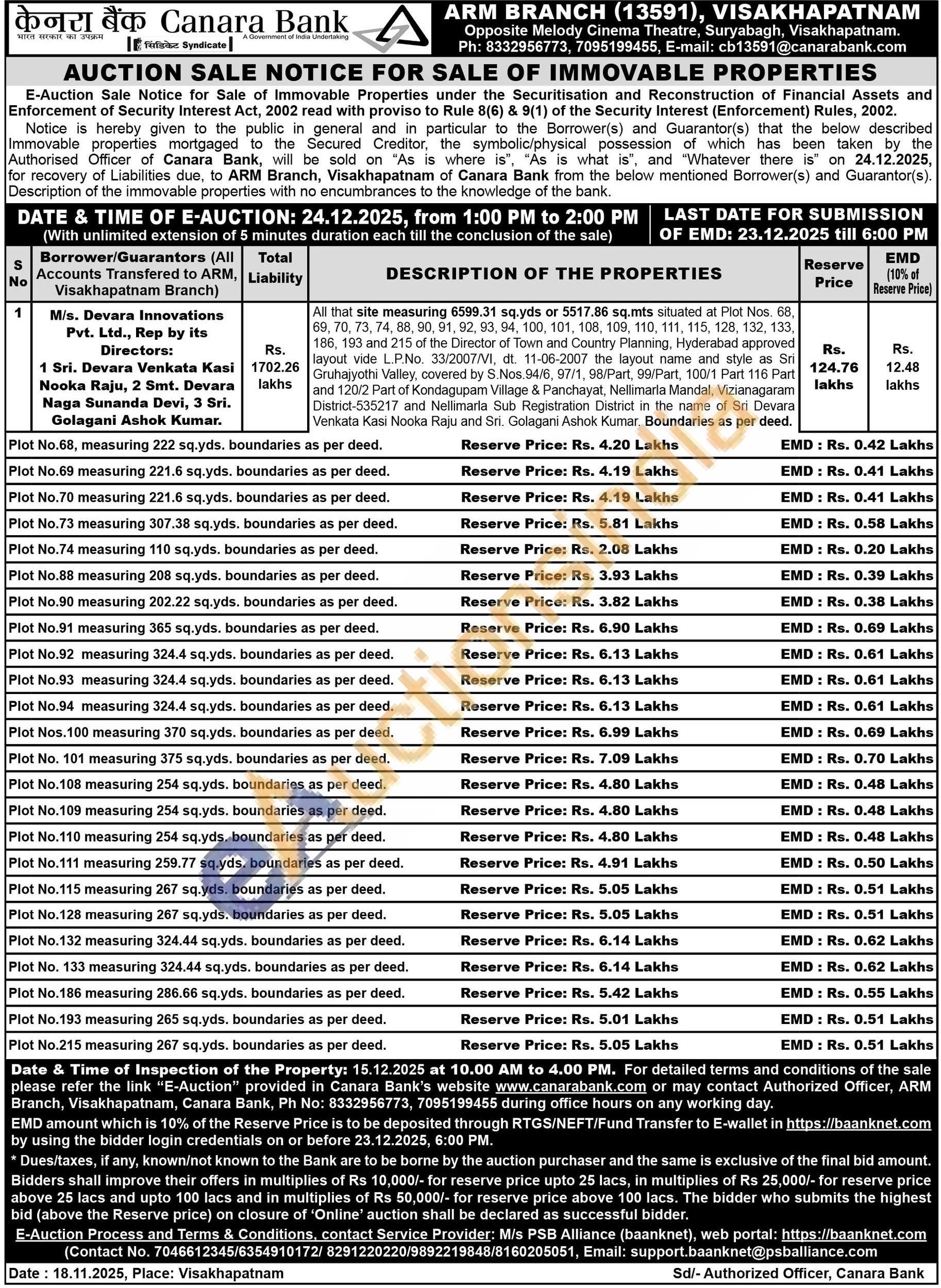 Contact Authorized Officer, ARM Branch, Visakhapatnam, Canara Bank, Ph No: 8332956773, 7095199455