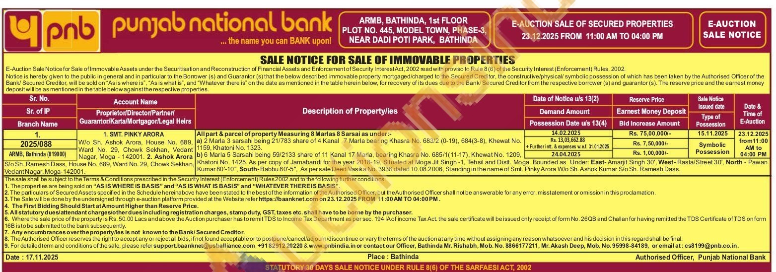 All part & parcel of property Measuring 8 Marlas 8 Sarsal as under:- 9. a) 2 Marla 3 sarsahi being 21/783 share of 4 Kanal 7 Marla bearing Khasra No. 683/2 (0-19), 684(3-8), Khewat No. nt 1159, Khatoni No. 1323. ra b) 6 Maria 5 Sarsahi being 59/2133 share of 11 Kanal 17 Marla, bearing Khasra No. 685/1(11-17), Khewat No. 1209, an. Khatoni No. 1425. As per copy of Jamabandi for the year 2018-19, Situated at Moga Jit Singh-1. Tehsil and Distt. Moga. Bounded as Under: East-Amarjit Singh 30', West-Rasta/Street 30', North - Pawan Kumar 80-10", South-Babbu 80-5", As per sale Deed Vasika No. 3936 dated 10.08.2006, Standing in the name of Smt. Pinky Arora W/o Sh. Ashok Kumar S/o Sh. Ramesh Dass.