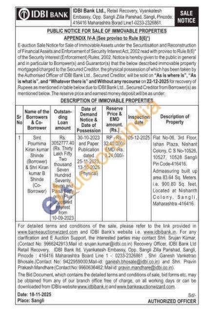 Flat No-06, 3rd Floor, Ishan Plaza, Nishant Colony, CS No-10526, 10527, 10528 Sangli Pin Code-416416, Admeasuring built up area 83.64 Sq. Meters