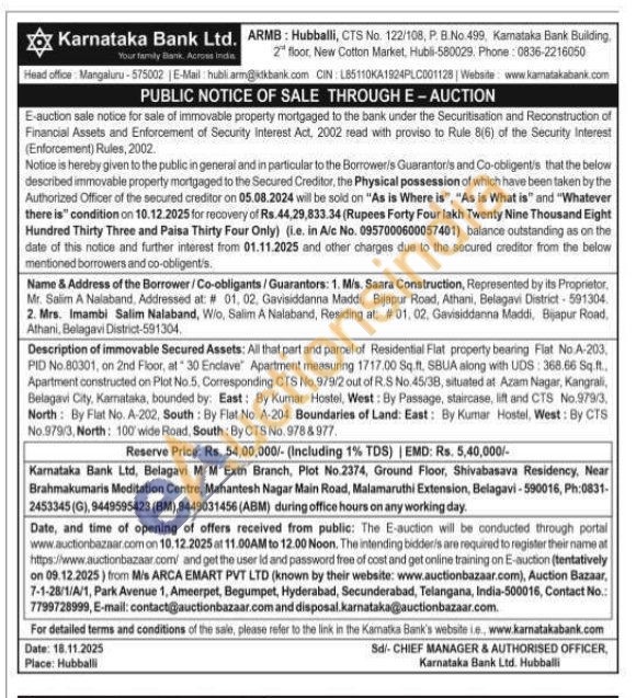 Description of immovable Secured Assets: All that part and parcel of Residential Flat property bearing Flat No A-203, PID No. 80301, on 2nd Floor, at 30 Enclave Apartment measuring 1717.00 Sq.ft. SBUA along with UDS: 368.66 Sq.ft. Apartment constructed on Plot No.5, Corresponding CTS No.979/2 out of R.S No. 45/38, situated at Azam Nagar, Kangrali, Belagavi City, Karnataka, bounded by: East: By Kumar Hostel, West: By Passage, staircase, lift and CTS No.979/3, North: By Flat No. A-202, South: By Flat No. A-204. Boundaries of Land: East: By Kumar Hostel, West: By CTS No.979/3, North: 100 wide Road, South: By CTS No. 9788977.