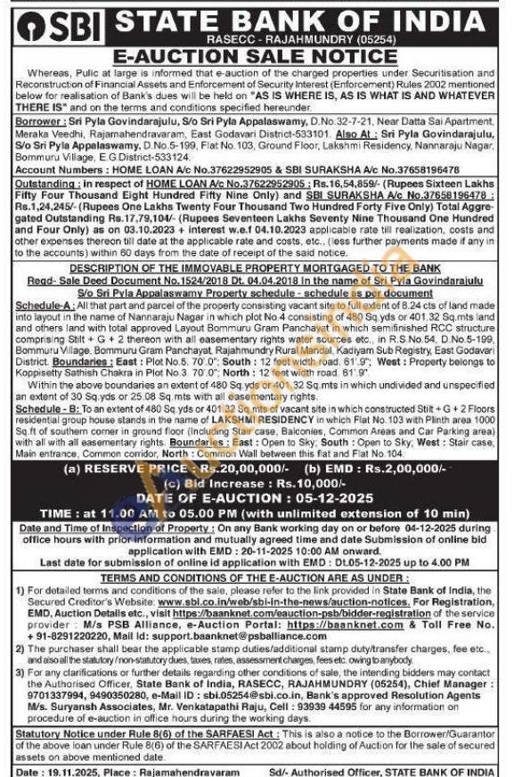 Schedule A: All that part and parcel of the property consisting vacant site to full extent of 8.24 cts of land made into layout in the name of Nannaraju Nagar in which plot No 4 consisting of 480 Sq yds or 401.32 Sq.mts land and others land with total approved Layout Bommuru Gram Panchayat in which semifinished RCC structure comprising Stilt+G+ 2 thereon with all easementary rights water sources etc., in R.S No.54. D.No.5-199, Bommuru Village. Bommuru Gram Panchayat Rajahmundry Rural Mandal, Kadiyam Sub Registry, East Godavari District Boundaries: East: Plot No.5. 70.0": South: 12 feet width road. 61.9"; West: Property belongs to Koppisetty Sathish Chakra in Plot No 3. 70.0", North: 12 feet width road 61.9" Schedule-B: To an extent of 480 Sq yds or 401.32 Sq.mts of vacant site in which constructed Stilt+G+2 Floors residential group house stands in the name of LAKSHMI RESIDENCY in which Flat No. 103 with Plinth area 1000 Sq.ft of southern comer in ground floor (Including Stair case, Balconies, Common Areas and Car Parking area) with all with all easementary rights. Boundaries: East: Open to Sky: South: Open to Sky, West: Stair case, Main entrance, Common corridor, North Common Wall between this flat and Flat No. 104.