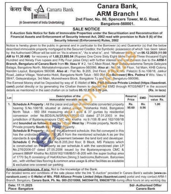 Schedule A Property: All the piece and parcel of immovable converted property bearing S.No. 108/18, situated at Jakkur village. Yelahanka Hobli, Bangalore North Taluk 560 064 measuing about I acre & 37 guntas by residential conversion order No.BDS/ALN/SR/NA/195/02-03 dated 27.01.2003 in the jurisdiction of Byatarayanapura CMC with khatha no.9/108/B and 162/108/18 and bounded as follows, East by: Road West by: Private property, North by: Private property South by: Private Property.Schedule B Property: As per the apartment schedule, this flat conveyed in this has the undivided share of 750 Sq.ft from the mentioned schedule A as per the standards & specification in JD agreement between the land lord and developer Schedule C Property: Flat No.B.205,2nd floor, B Block, MS Palazzo which is constructed on the property as per schedule A with the sanctioned plan LP No. 276/2006-07 dated 27.05.2006 issued by the Byatarayanapura CMC & present BBMP Khatha No. 820/1/162/108/IB/51-8-205 with the super builtup area of 1770 Sq.ft consisting of Hall, Kitchen, Dining, 3 bedrooms, Bathroom, Balconies etc., with vitrified tiles flooring & common area usage & other facilities as available & exclusive one covered car parking.