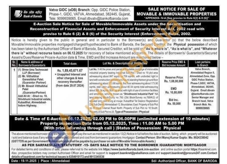 Lot No. 1 Al the pices and parcel of Equitable mortgage of immovable Industrial property bearing Industrial Sub Pilot / Shed ne 19 plot area admeasuring about 847 sqyds le.709 sqmtrs, with undivided right in land with construction (present and future) standing thereon ground floor admeasuring about 173.90 sumts, first floor admeasuring about 173.90 somes, star cabin admeasuring about 40:34 sqmbi total admeasuring about 388.14 sqmts (Bull up area) with right of use of common facittes and amenities, scheme known as "Shivbhoomi Industrial Park" NA land beanng Block/Surey no 780 (Old Block Survey no.769/K/2) of silualed lying and being al mouje: Kubadthal Tal Daskroi Registration Dist Sub District Ahmedabad-12. Boundaries: East Property of Sub Plat no 40 West Internal Road North Property of Sub Plot no 18 South: Property of Sut Platno 20. Type of Possession: Physical