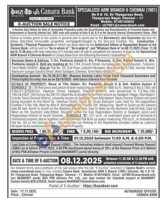 SCHEDULE "A"; All that piece and parcel of land measuring an extent of 1800 sq.ft., bearing D.No. 5,789, old D.No.3/1,3/283/3(4), Vaaniyar Street, Saidapet, Chennai 600015, and comprised in TS. Nos. 105, 105/18105/2, Old Survey No.28/1A1, Block No.6, situated at formerly known as Saidapet Village, Mambalam-Guindy Taluk Chennai District, presently known as Saidapet Town, Mambalam Taluk, Chennai District and land being bounded on the North by: Vanniyar Street, South by: Divan Bashyam Lane, East by: Mr.Loganathan Chettiar-T.S.No. 106, West by Mrs.R. Nirmala&others-T.S.No. 104. Measuring: North to South on the Eastern side:90 feet, North to South on the Western side 90 feet, East to West on the Northern side 20 feet, East to West on the Southern side:20feet. Situated within the Sub Registration District of Saidapet Joint-Land Registration District of South Chennal SCHEDULE "B": 311 sq.ft., of undiveded share out of Schedule-A mentioned property above together with Residential Flat Built up space measuring 750 sq.ft., or thereabouts Flat No. S3 on the Second Floor, including One Car Parking in the Residential complex called as Lakshmi Nivasam to be constructed on the Schedule A Property